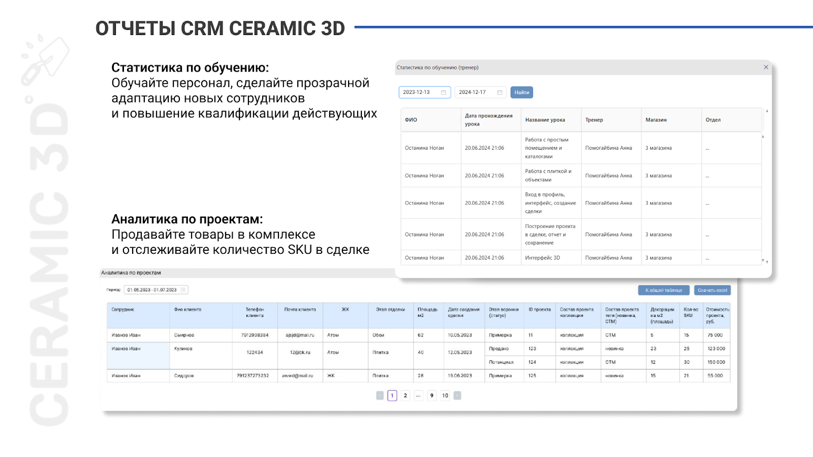 - Статистика по обучению: Ceramic 3D предлагает несколько форматов обучения команды и формирует отчеты по количеству пройденных уроков на Интерактивной платформе или с тренерами. Эта аналитика поможет мотивировать сотрудников и отслеживать процесс обучения в реальном времени.