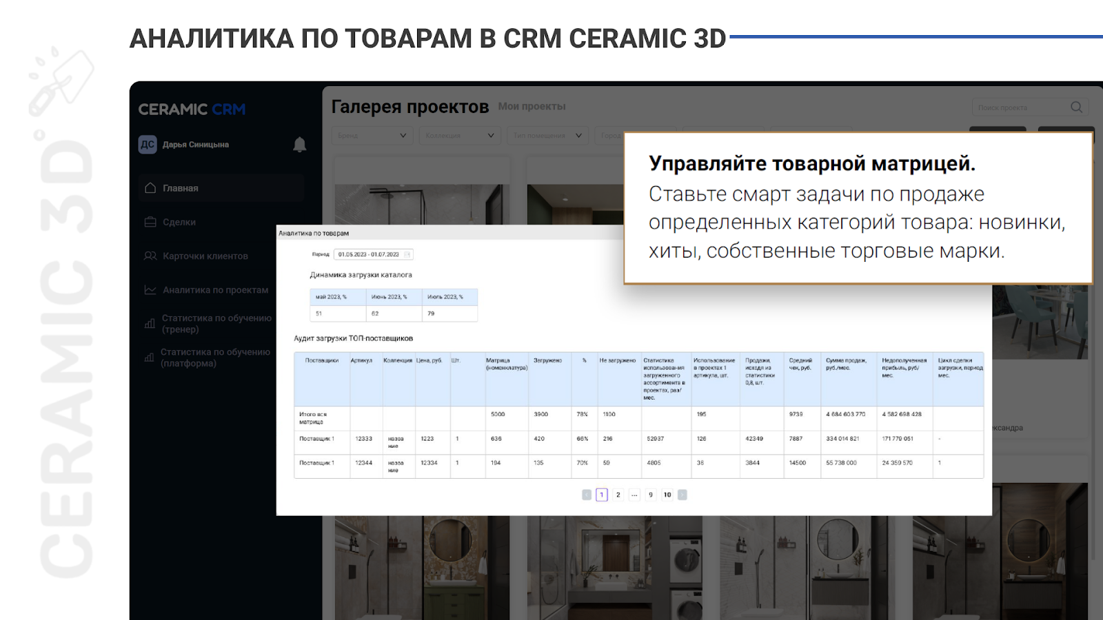 Современные системы для автоматизации учёта, прогнозирования спроса и оптимизации поставок, могут помочь избежать таких потерь. CRM Ceramic 3D уже адаптирована под потребности строительного ритейла и позволяет собирать аналитику по продажам, отслеживать наиболее популярные позиции и планировать закупки на основании отчетов. Кроме того, в CRM доступна товарная интеграция с 1С для минимизации ошибок и оперативного обмена информацией об остатках на складе и продажах.