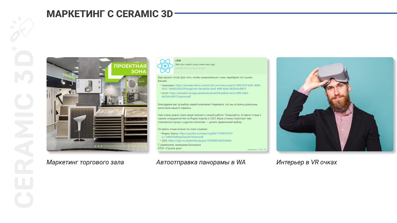 - CRM Ceramic 3D поможет персонализировать общение с покупателем и автоматизировать наполнение вашего сайта контентом. В системе доступна настройка автоматической отправки проекта с панорамой и отчетом клиенту в мессенджер при переводе сделки в новый статус, предусмотрен API для автоматического размещения панорам проектов на сайте. Кроме того, CRM генерирует QR-коды для каждого опубликованного проекта – их можно размещать на баннерах, в карточке компании на онлайн-картах для показа панорам и сбора лидов на примерку готовых решений.