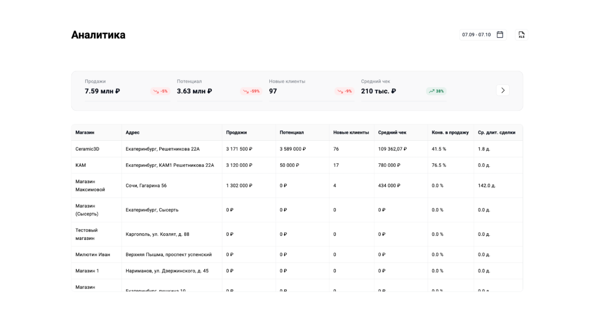 Выберите нужный период в общей аналитике и нажмите кнопку XLS. Система мгновенно подготовит файл, в котором данные будут аккуратно разложены по листам: отдельно по магазинам, отделам и сотрудникам.