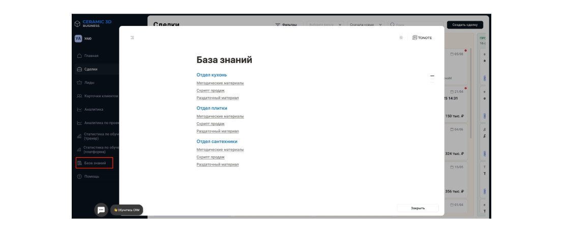 - База знаний: В CRM появился внутренний портал с инструкциями, скриптами продаж и методичками. Это ваша корпоративная библиотека лучших практик, которая помогает новичкам быстрее влиться в работу, а опытным сотрудникам — подсмотреть эффективные приёмы.