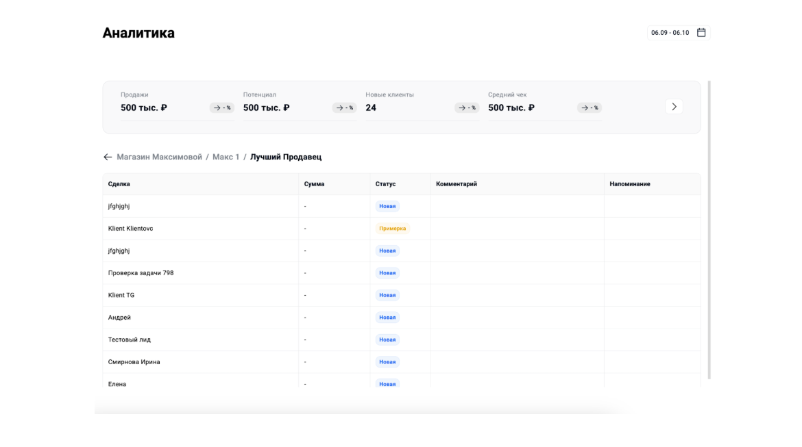 - Аналитика для всех ролей: Теперь не только руководители, но и продавцы видят свою персональную и командную аналитику. Когда сотрудник наглядно видит свой вклад, средний чек и конверсию, это лучшая мотивация для роста и осознанной работы.